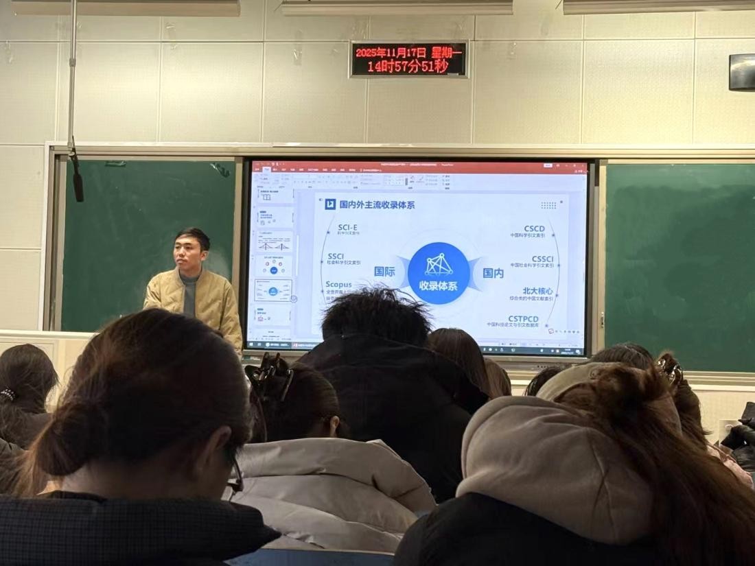 于2025年11月17日下午举办了研究生科研专题培训会,特邀湖南纬度信息科技有限公司张杨担任主讲。本次培训会由学院学科(科研)秘书张倩主持,全体研究生参加。