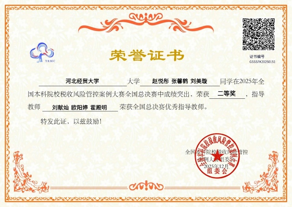 12月6日,2025年全国本科院校税收风险管控案例大赛总决赛在浙江财经大学圆满落幕。我校由赵悦彤、张馨鹤、刘美璇三位同学组成的代表队在刘献灿、欧阳婷、霍殿明三位老师的悉心指导下,凭借扎实的专业知识、出色的案例分析能力和稳定的现场发挥,荣获全国总决赛二等奖,取得我校参加该赛事以来的最好成绩。在此之前的分赛区比赛中,揭秘十大游戏赌博榜单