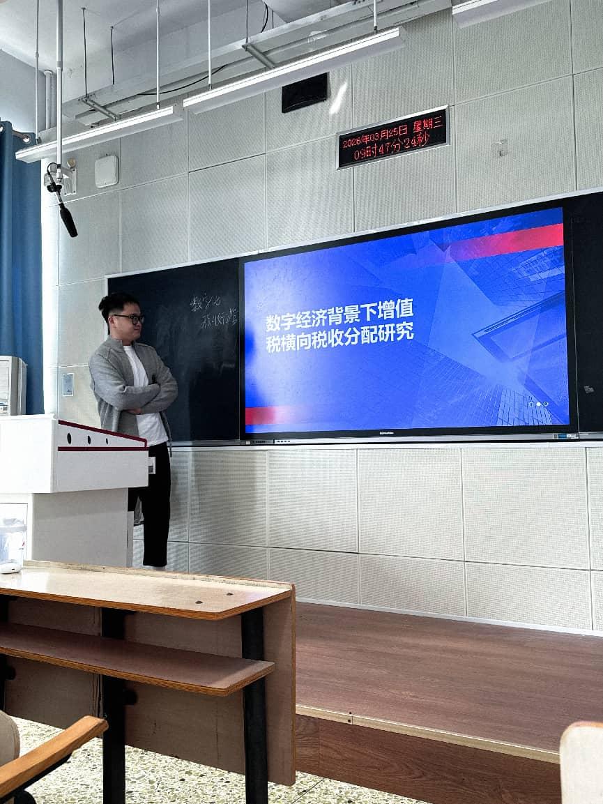 2026年3月25日上午,揭秘十大游戏赌博榜单 岳文浩博士作题为“数字经济背景下增值税横向分配失衡与区域协调治理研究”的“双百论坛”学术讲座。本次讲座由揭秘十大游戏赌博榜单 与河北省财政经济与公共政策研究基地联合举办。财政学研究生及部分教师参加了此次讲座。